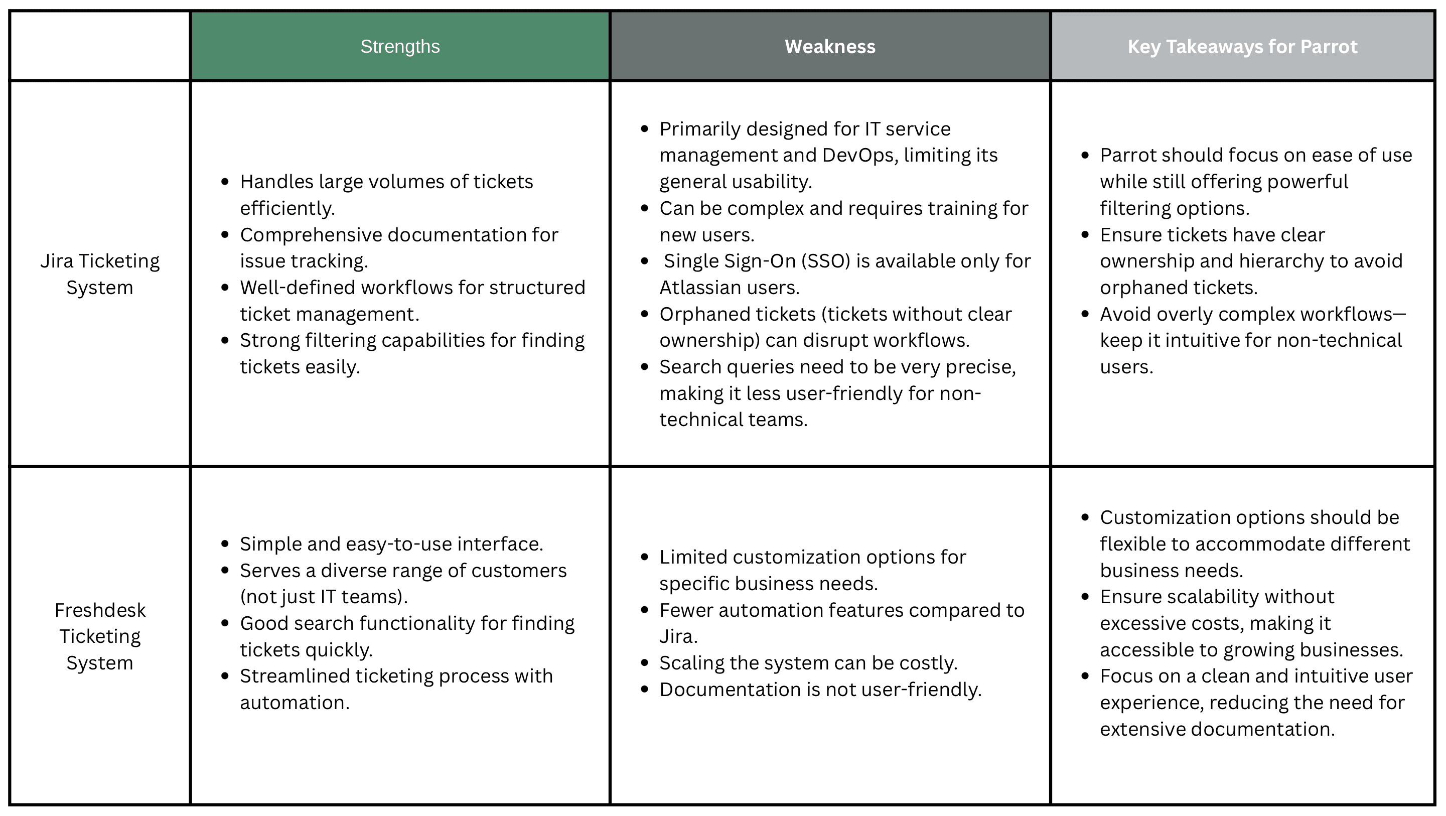 To design an effective and user-friendly ticketing system for Parrot, I analyzed existing industry leaders like Jira and Freshdesk to identify their strengths, weaknesses, and usability gaps. Since Parrot is introducing ticketing as a new feature, this analysis helped me extract the best functionalities while avoiding common pain points.