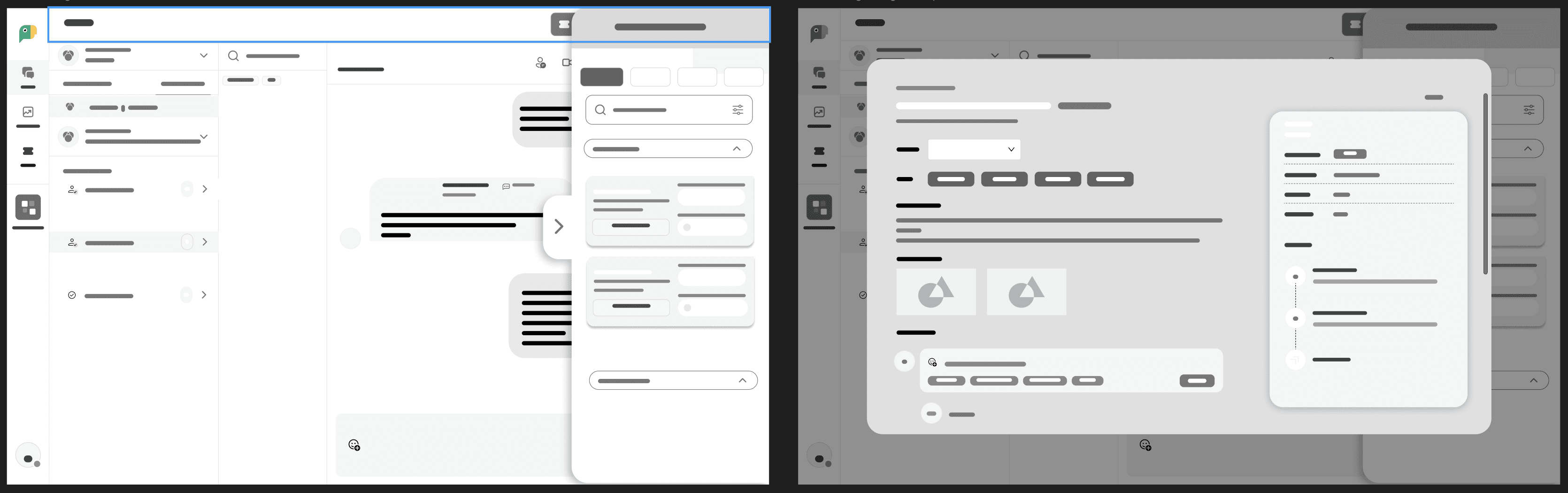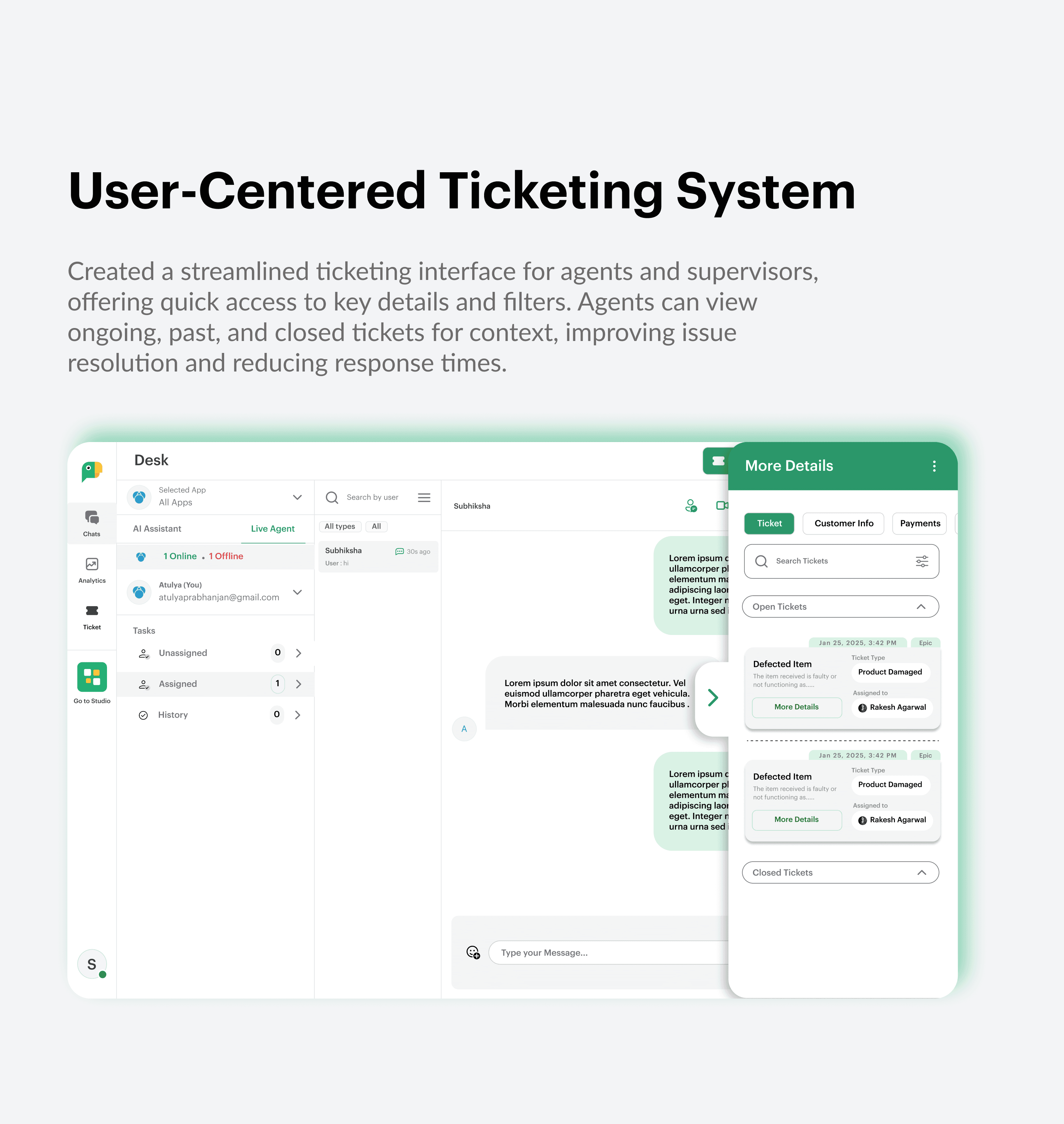 I began by replicating the agent's desk setup to maintain familiarity. To seamlessly integrate the ticket creation feature, I added a "Create Ticket" button in the top right corner. Additionally, a hidden right panel was introduced, displaying both ongoing and closed tickets for the customer the agent is assisting, ensuring quick access to ticket history.