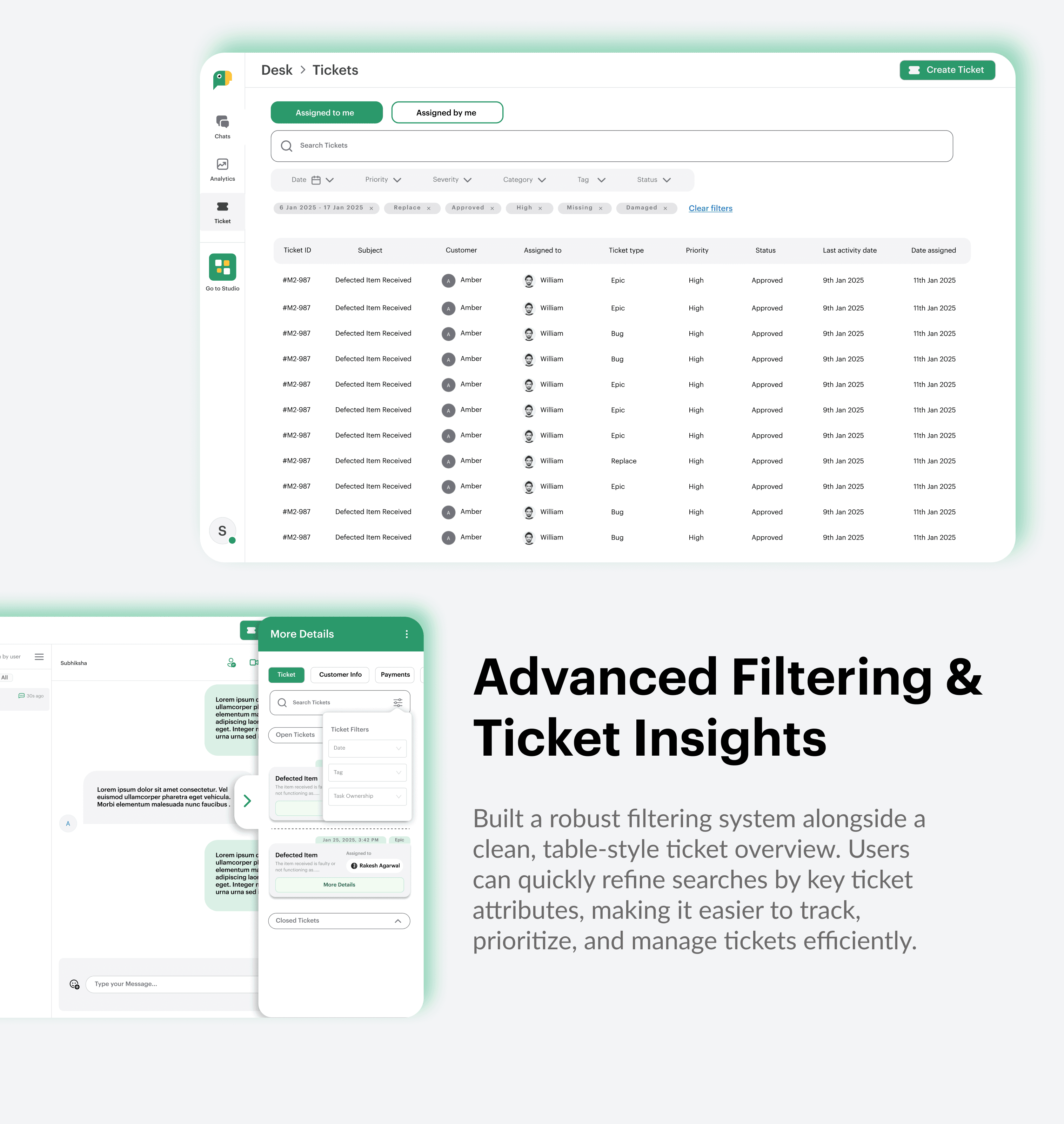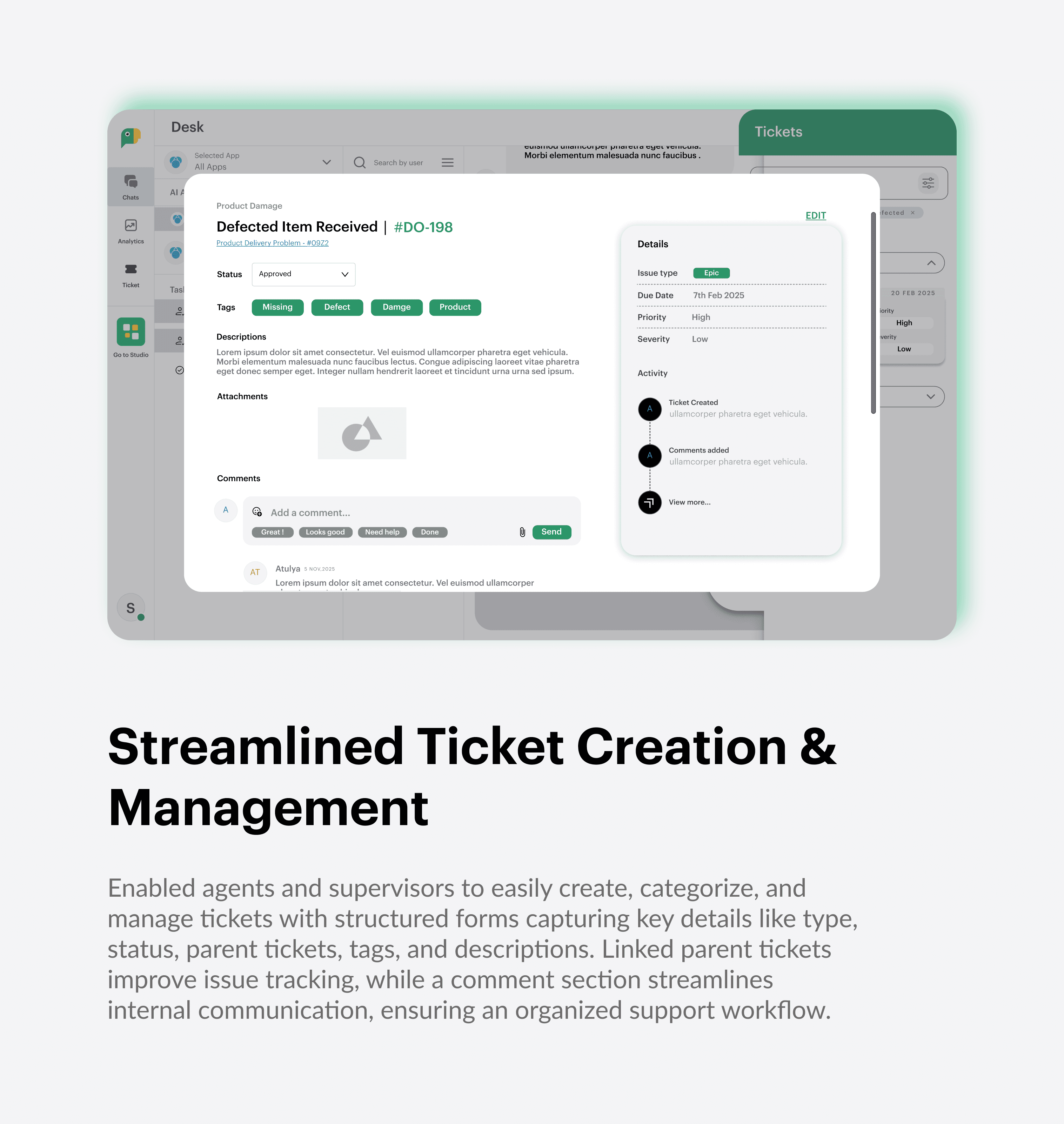 I designed a detailed ticket view displaying key information like title, ID, parent ticket, tags, description, attachments, comments, type, status, creation date, and activity history tracking its lifecycle. Users can create new tickets with fields for type, seniority, priority, status, and customer details.