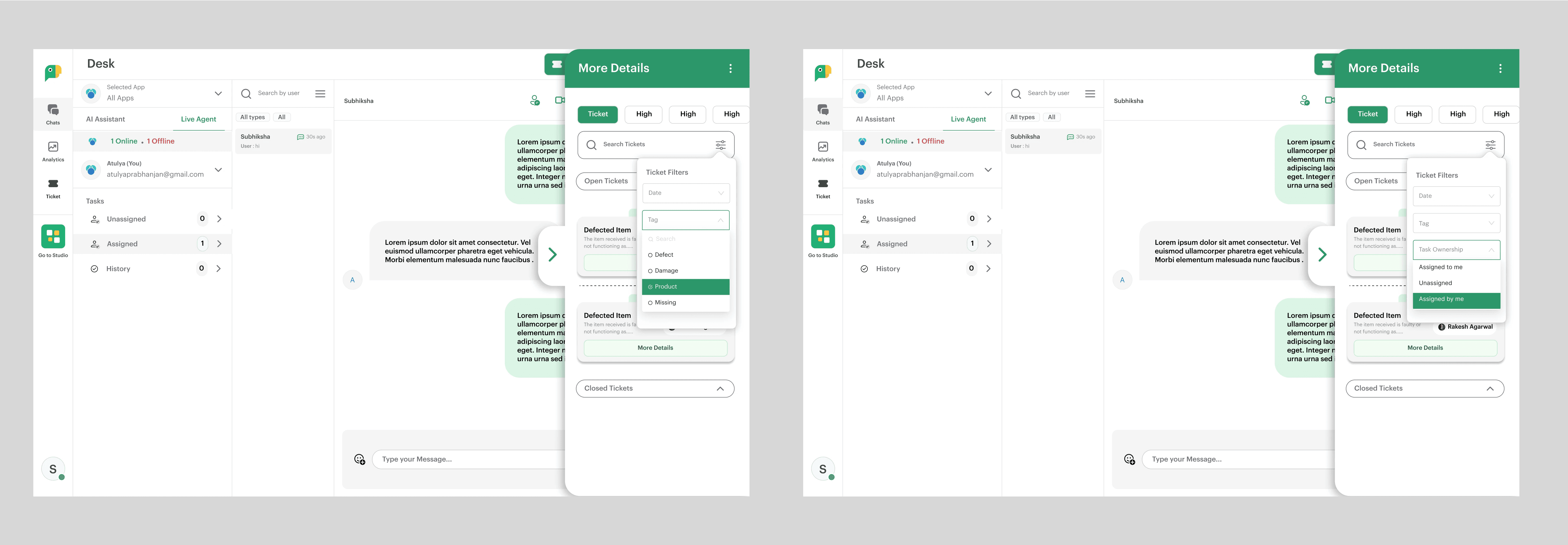 Next, I incorporated a search bar and an advanced filtering system to refine tickets by date, tag, and task ownership. Each dropdown included additional filtering options such as Today, Yesterday, Last Week, Last Month, and Custom. Selecting Custom opens a calendar view, allowing users to set a specific date range for precise ticket searches.